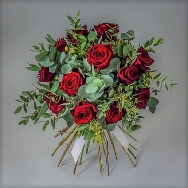 Twelve long-stemmed red roses embellished with seasonal greenery. A Valentine's Day classic.