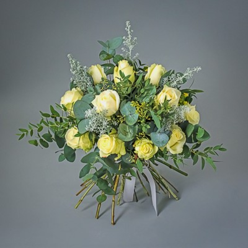 Twelve long-stemmed roses in your choice of white or pale pink, embellished with seasonal greenery. Pretty and romantic.